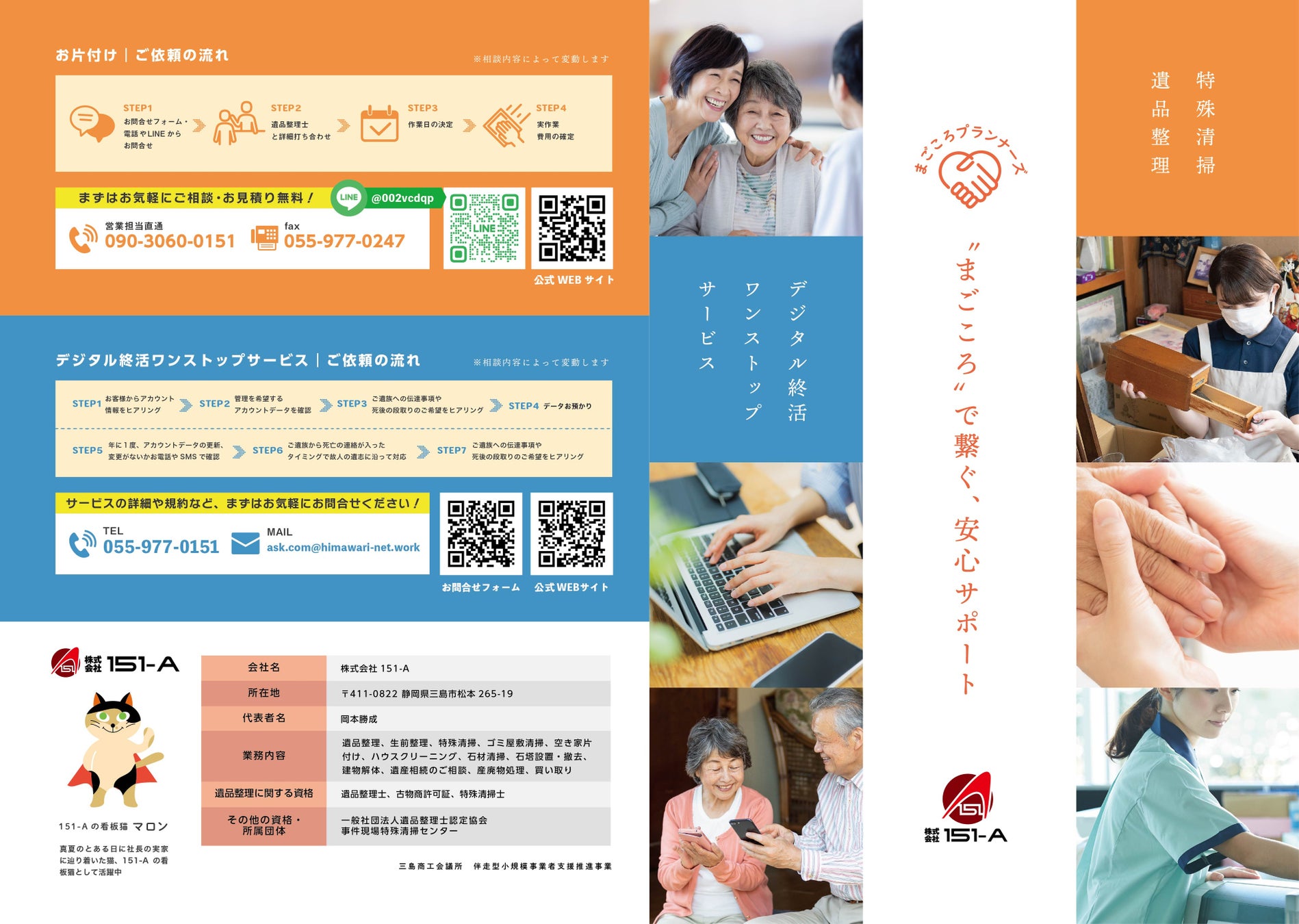 遺品整理「まごころプランナーズ」を運営する、株式会社151-A(いちごいちえ、所在地:静岡県三島市松本265-19、代表取締役:岡本 勝成 おかもと かつなり、以下 「当社」)は、2025年2月、エコパソ株式会社(所在地:静岡県三島市南田町3-19アイダ産業ビル1F、代表取締役社長:佐藤 良太 さとう りょうた)と提携し、デジタル機器のID、パスワード等のデータ保管から削除代行までを行う「デジタル終活ワンストップサービス」を開始いたします。