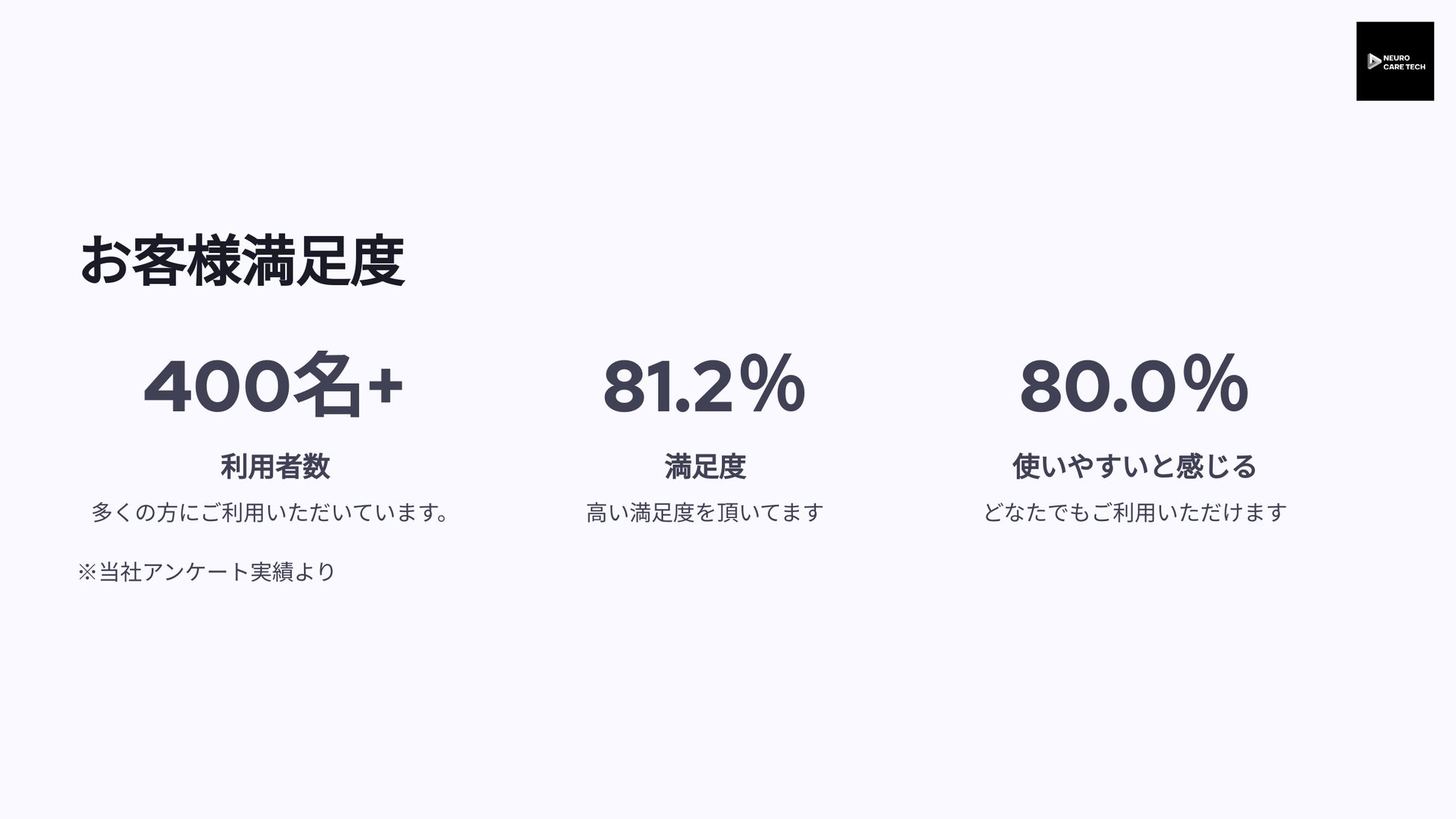 NEURO CARE TECH株式会社は、技術とサービスを通じて、認知症ケアの新しい選択肢を作り、「認知症になっても大丈夫」と誰もが思える社会を実現するため、日々努力を重ねてまいります。