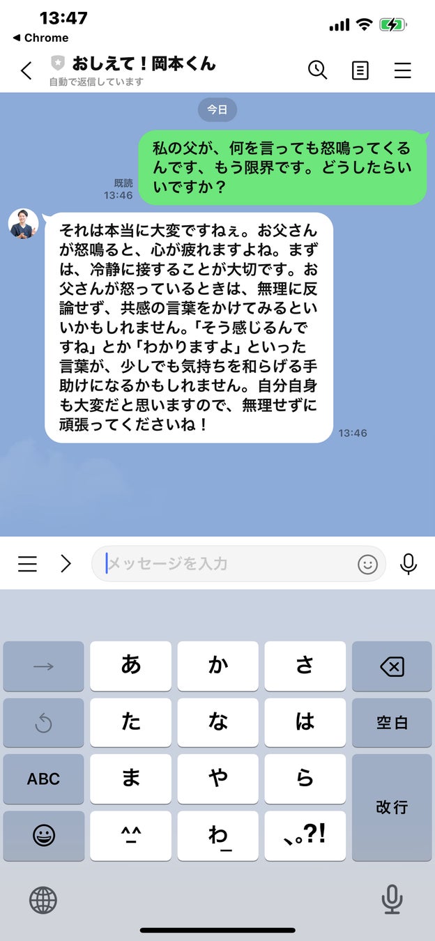 『おしえて岡本くん!』は、LINEを通じて24時間365日、認知症に関する悩みや質問に即時にパーソナルなアドバイスを提供するAIチャットボットです。これにより、認知症患者を持つご家族やビジネスケアラー、介護・医療従事者の精神的負担を軽減し、情報不足を解消します。特別な技術は必要なく、LINEを送るだけで簡単にご利用いただけます。