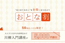 株式会社ユーキャンは、2016年9月1日(木)より、趣味や学びなど、”はじめてみたい”ことをはじめたい大人の方々に向けた『ユーキャン大人クラス』サイトをオープンいたしました。また、サイトオープンと同時に川柳講座にて「おとな割」も実施いたします。