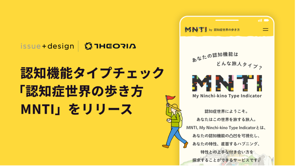 特定非営利活動法人イシュープラスデザイン(東京事務所:東京都文京区/代表:筧 裕介、以下issue+design)は、テオリア・テクノロジーズ株式会社(本社:東京都千代田区/代表取締役CEO:坂田 耕平、以下 テオリア)と協働し、自分の認知機能タイプをチェックできるWebサービス「認知症世界の歩き方 MNTI(My Ninchi-kino Type Indicator)(以下MNTI)」の提供を開始しました。