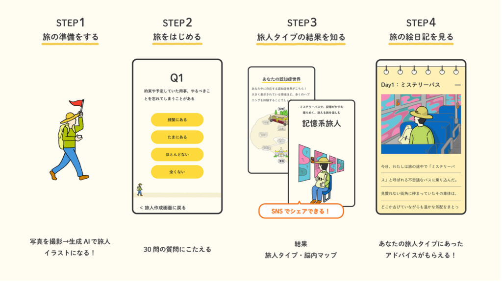 「認知症世界の歩き方 MNTI」は、スマホやタブレット、パソコンから使えます。自分の顔写真の撮影を行い、30問の簡単な質問に答えるだけで、すぐに結果が見られます。撮影した写真は、生成AIが作った旅人の顔のイラストになり、結果をSNSでシェアしたり、メールで保存することもできます。