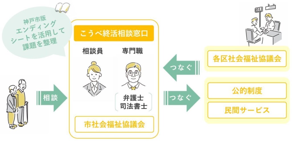 「こうべ終活相談窓口」は遺言や葬儀など終活に関する相談を無料で受け付け、弁護士や司法書士による専門相談も提供する取り組みです。