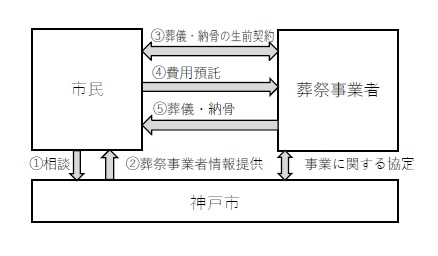 3)相談者と葬祭事業者との間で希望する葬儀、納骨などについて合意できれば、市の相談員立ち合いのもと生前契約(死後事務委任契約)を結んでいただきます。