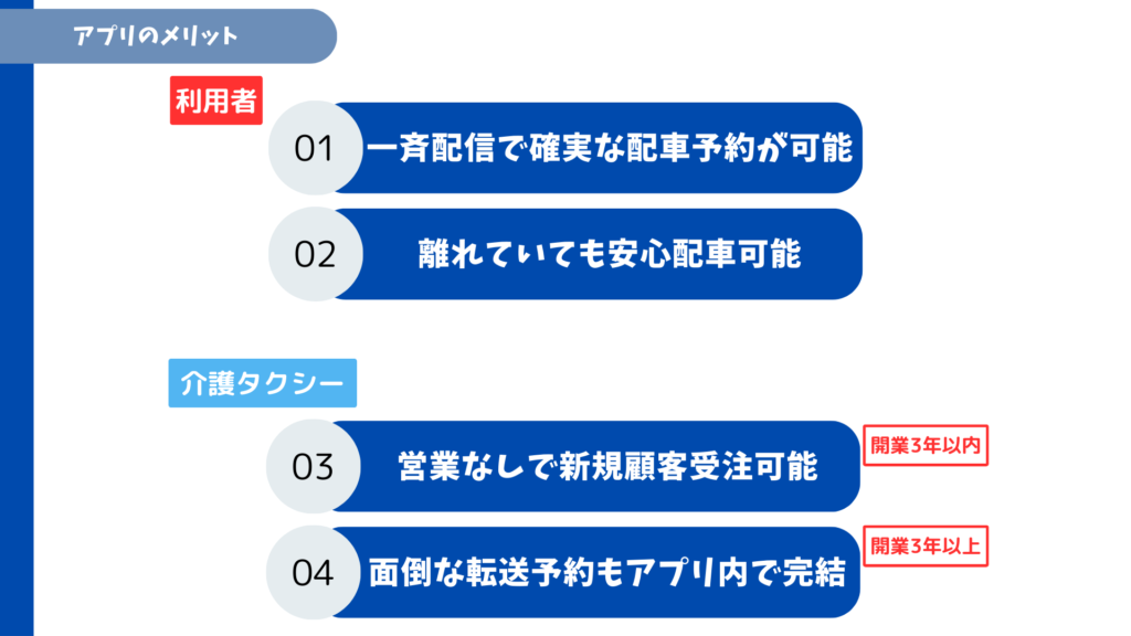 - 介護タクシー事業者と利用者をアプリ上で直接マッチング