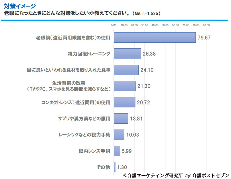 「老眼になったときにどんな対策をしたいか教えてください」という質問をしたところ、8割が「老眼鏡(遠近両用眼鏡を含む)の使用」と回答し、次に「視力回復トレーニング」(26.38%)や「目に良いといわれる食材を取り入れた食事」(24.10%)と続きました。