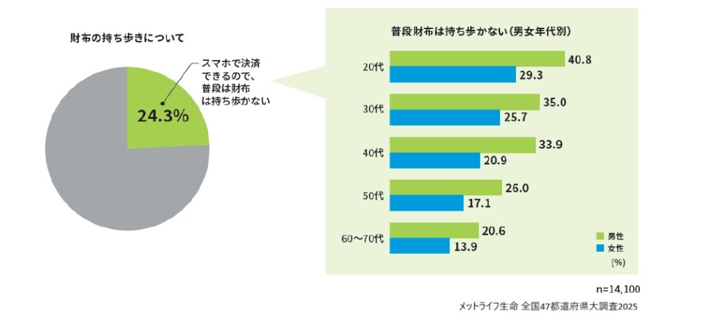 財布を持ち歩かない人は全体で約4人に1人にのぼり、特に20代男性では約4割と高い割合を示すなど、若年層ほどその傾向が強いことが明らかになりました。一方、マイナンバーカードについては、全体で約6割が携帯しており、20代では約3人に2人が持ち歩いていると回答。40~50代との意識・行動の違いが鮮明に表れる結果となりました。