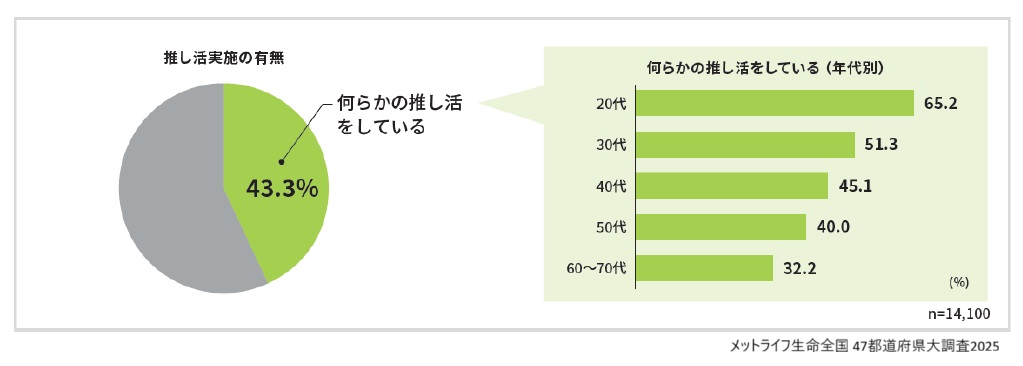 全体の4割が応援する「推し」がいると回答。若年層ほど推し活をしている割合が高く、20代では65.2%が推し活をしています。
