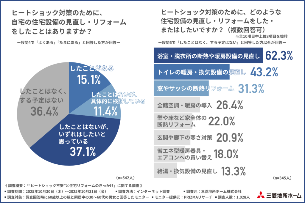 三菱地所ホーム株式会社(所在地:東京都新宿区、代表取締役社長:細谷 惣一郎)は、60歳以上の親と同居中の30〜60代の男女を対象に、「“ヒートショック不安”と住宅リフォームのきっかけ」に関する調査を行いました。