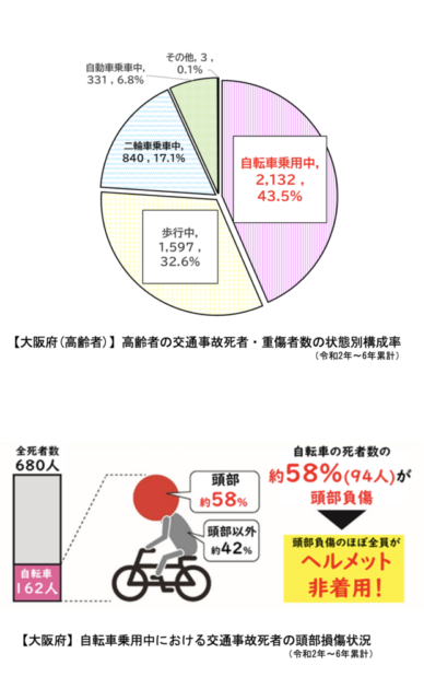 令和6 年の大阪府の自転車事故による死者数は34人で、2 年連続全国最下位。重傷者数は1,076 人と、9年連続で全国最下位となっています。また、過去5 年間(令和2年~6 年)の交通事故死者・重傷者数の状態別構成率を見ると、大阪府は「自転車乗用中」の割合が全国平均の約1.5 倍と高く、なかでも65 歳以上の高齢者は全体の43.5%を占めています。さらに、自転車乗用中の死亡事故の約6 割は頭部に致命傷を負っており、そのほとんどがヘルメット非着用でした。一方で、大阪府の自転車ヘルメット着用率は令和7 年で7.2%と全国最下位(全国平均21.2%)となっています。