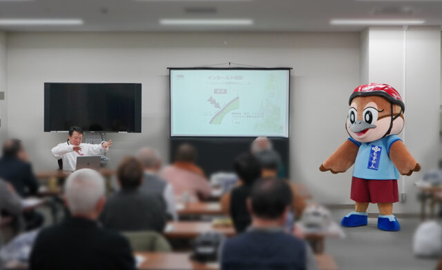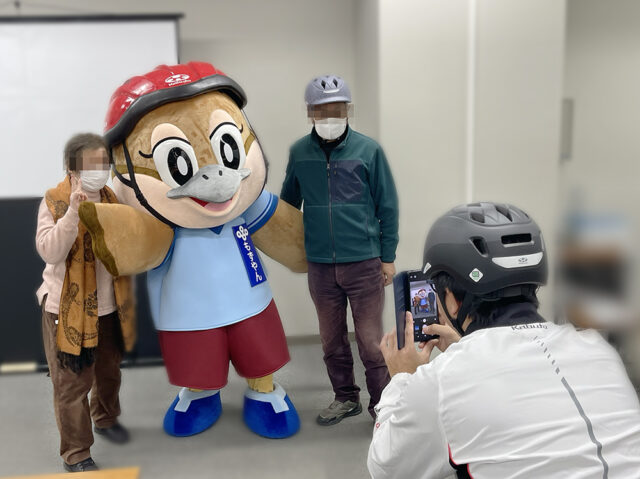 ヘルメットを着用した大阪府広報担当副知事もずやんも登場し、ヘルメットの衝撃吸収の仕組みをレクチャー