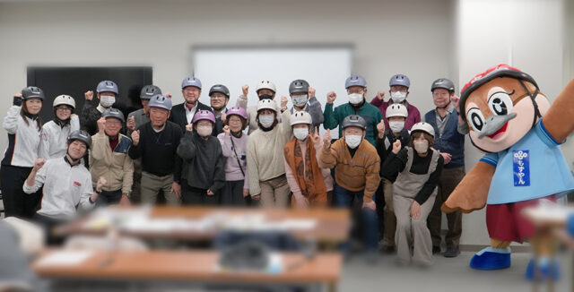 大阪府庁で実施された事前講習に集まった参加者さん。もずやんと一緒に、ヘルメット着用姿を見せる啓発「頑張るぞ!」