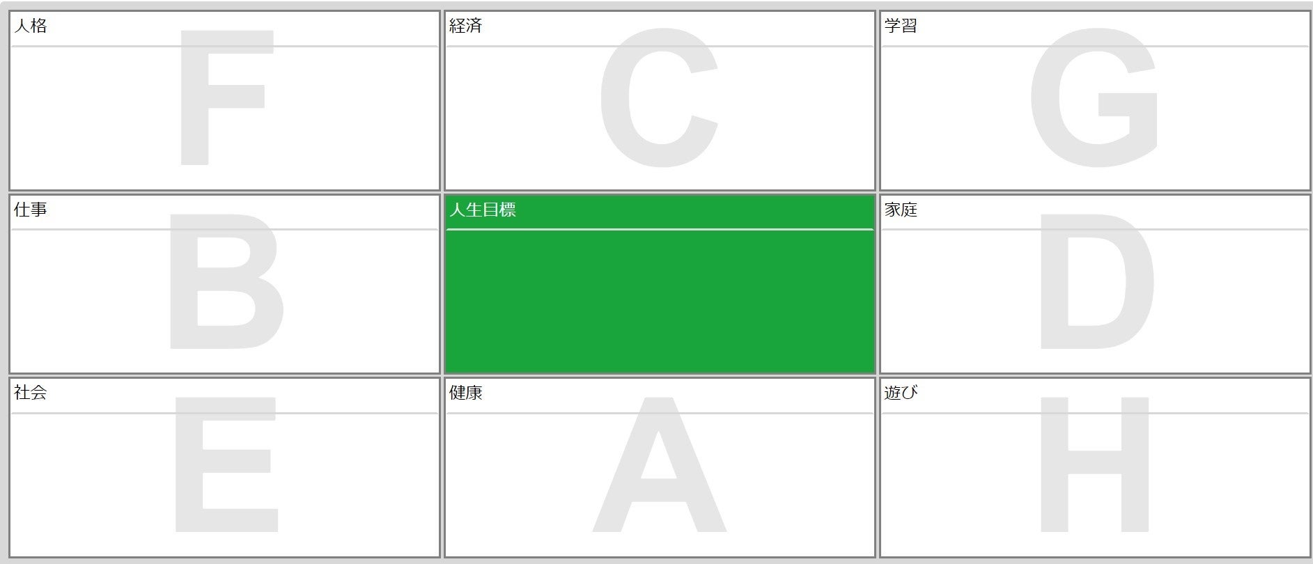 SELFingシートには「人生目標」(人生を通した目標設定)と「3年後の自分」(短期の目標設定)の2種類があり、「人生目標」シートは、真ん中に「人生目標」、周囲8マスには人生を構成する8大分野「健康」「仕事」「経済」「家庭」「社会」「人格」「学習」「遊び」が設定されています。「3年後の自分」シートは、主に人生目標シートの「仕事」で設定した目標から発展させて作成します。
