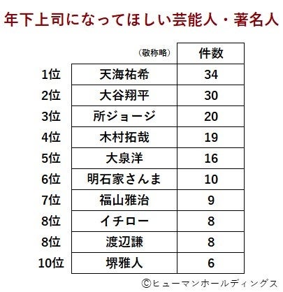 ●「年下上司になってほしい芸能人・著名人」は、1位「天海祐希」、2位「大谷翔平」、3位「所ジョージ」