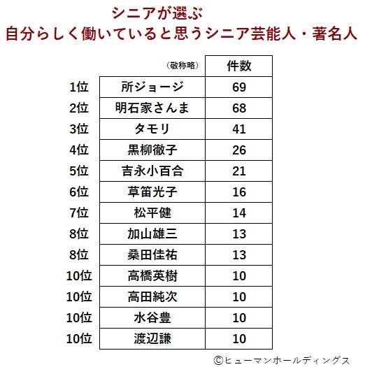 「自分らしく働いていると思うシニア(65歳以上)の芸能人・著名人」(自由回答)の1位は、「所ジョージ」さんでした。理由としては「いきいきしている」「楽しそう」「仕事と好きな事、趣味との両立」が多くを占めました。