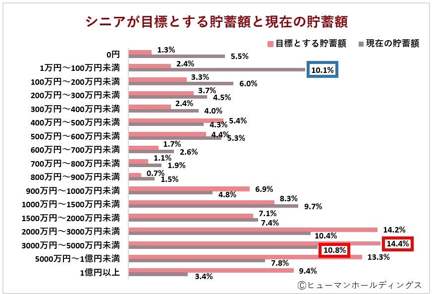 「目標とする貯蓄額」については、「3000万円~5000円未満」(14.4%)が一番多い結果となり、「2000万円~3000万円未満」(14.2%)が続きました。「現在の貯蓄額」についても「3000万円~5000万円未満」(10.8%)が最多、次いで「2000万円~3000万円未満」(10.4%)と、目標額と大きな差がない状況が見られる一方、「1万円~100万円未満」(10.1%)が3番目に多く挙げられています。