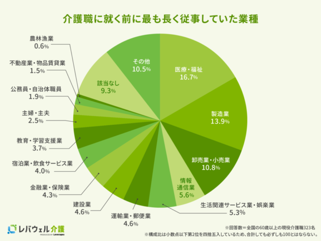 シニア世代の現役介護職員に、介護職に就く前に最も長く従事していた業種を聞いたところ、介護職を除く「医療・福祉職」(16.7%)が最多でした。次いで「製造業」(13.9%)、「卸売業・小売業」(10.8%)が続き、全体では約6割が異業種から介護職へ転職していることが明らかになりました。