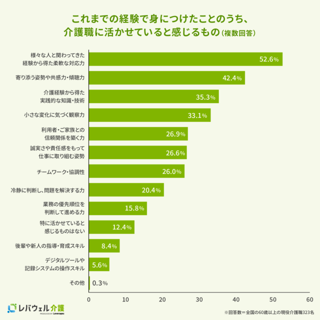 これまでの経験で身につけたことのうち、現在の介護職に活かせていると感じる点を聞いたところ、「様々な人と関わってきた経験から得た柔軟な対応力」(52.6%)や「寄り添う姿勢や共感力・傾聴力」(42.4%)といった回答が多く挙がりました。介護職は専門知識や技術だけでなく、人と関わる力も求められる職種であることから、多様な職務経験や人生経験を活かしやすい仕事であることが示されました。
