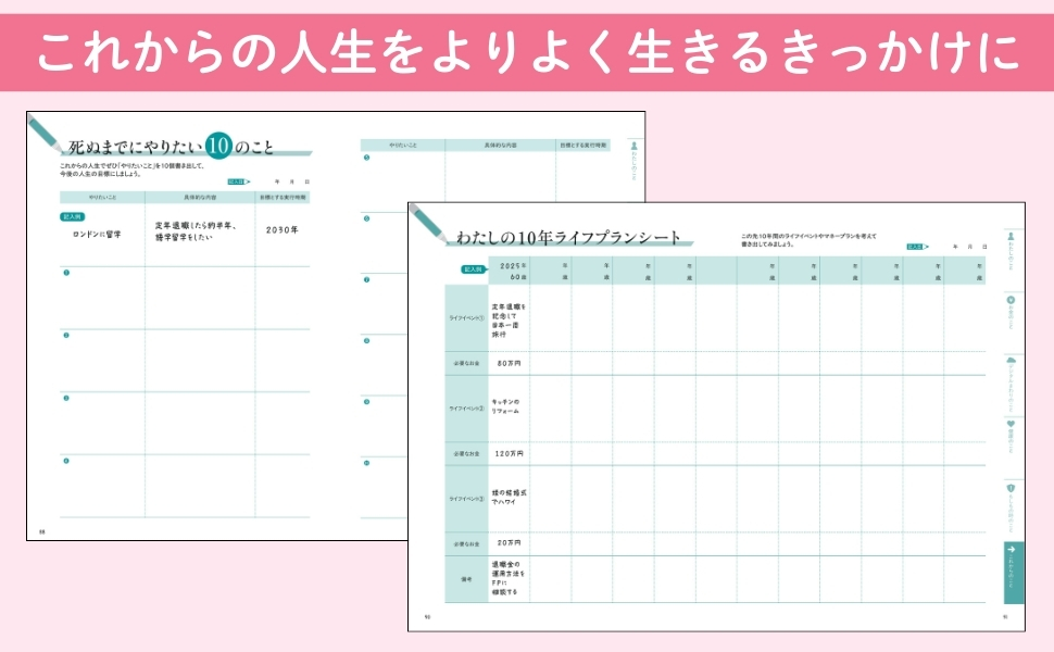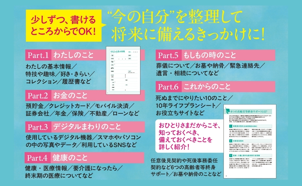 書き出すことで身の回りを整理し、自分を見つめ直すことができます。それは、これからの人生や老後をよりよく生きるための大切な一歩。本書には「死ぬまでにやりたい10のこと」や「わたしの10年ライフプランシート」など、未来について書き込むページも掲載しています。