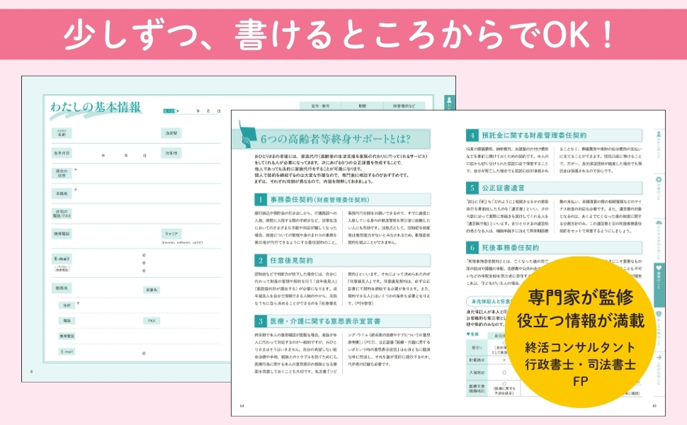 さらに、終活コンサルタント、行政書士や司法書士、FPなど各分野の専門家が監修しているため、信頼できる情報が満載。少しずつ書き込むだけで、将来きっと役立つ1冊になります。