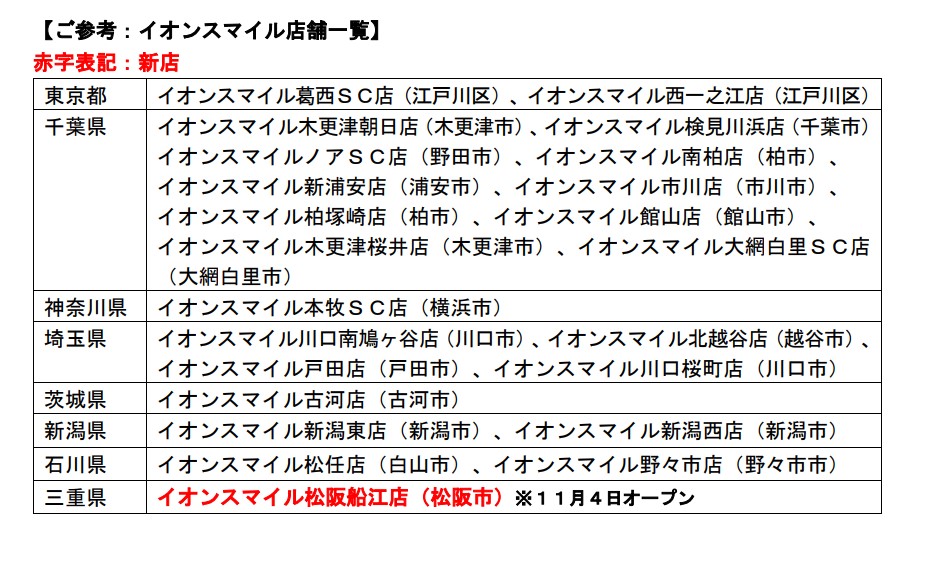 ※2:「イオンスマイル館山店」(千葉県館山市)、「イオンスマイル大網白里SC店」(千葉県大網白里市)、「イオンスマイル古河店」(茨城県古河市)、「イオンスマイル新潟東店」(新潟市東区)、「イオンスマイル新潟西店」(新潟市西区)、「イオンスマイル松任店」(石川県白山市)、「イオンスマイル野々市店」(石川県野々市市)で実施しています。