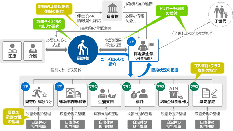 「判断能力に問題がなく、資力が平均的な高齢者」を対象に、既存の支援サービス事例を分析し、SOLOサポートに求められる機能を整理します。また、自治体と民間企業が連携して取り組む際の役割分担や課題などを整理し、企業の経営資源や地域特性に応じたビジネスモデルのパターンを検討します。