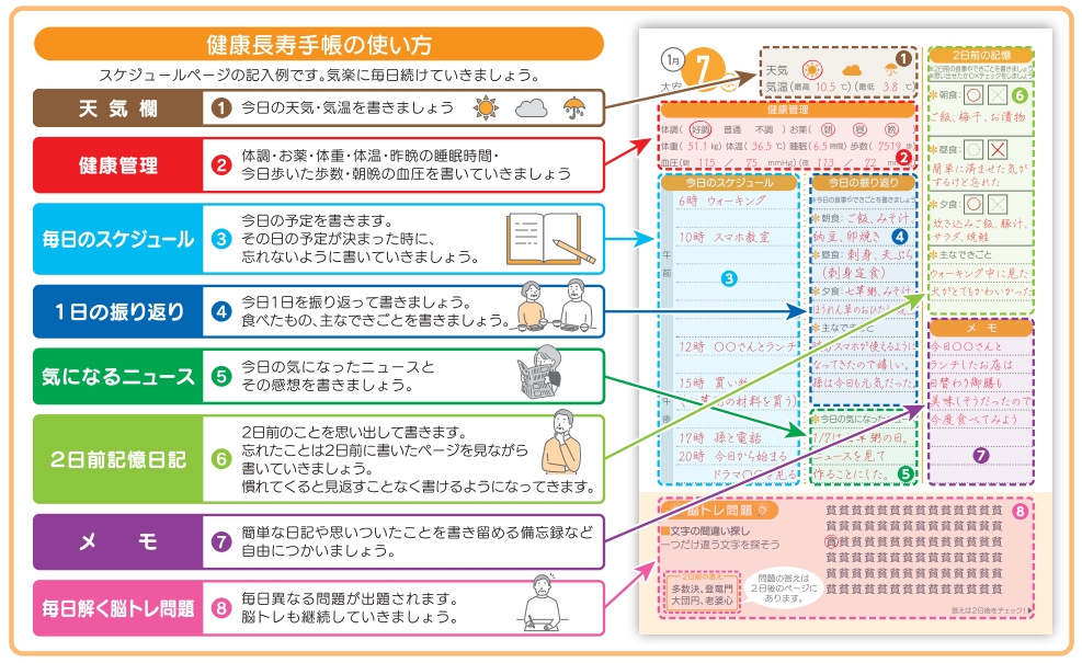 日々の予定管理から健康チェック、そして脳トレまで、幅広い機能を1冊に集約しています。