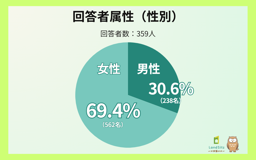 今回の調査では、女性が69.36%(249名)、男性が30.64%(110名)という構成となりました。