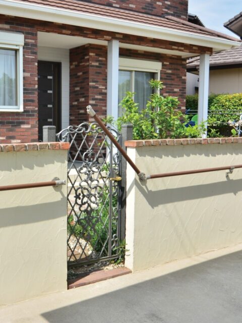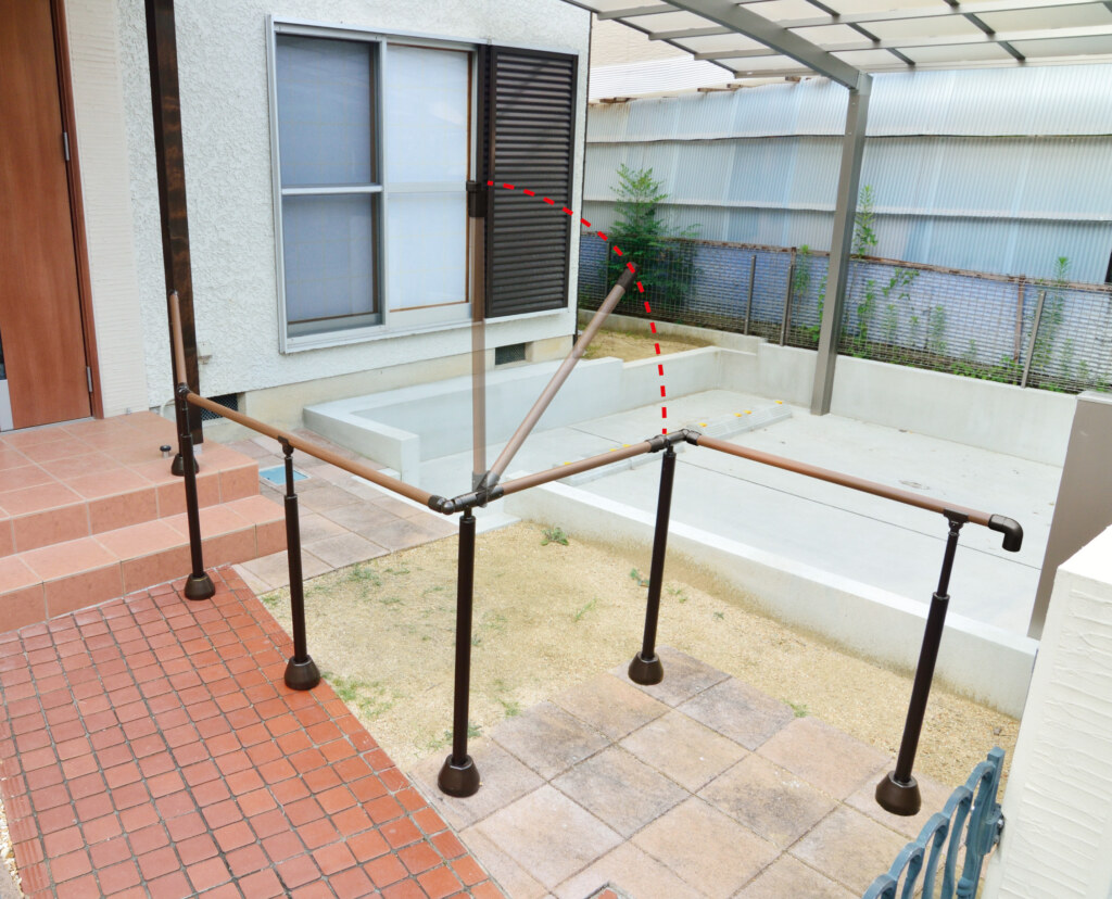 屋外用手すりシリーズ「フリーRレール」の遮断機式支柱。車庫への動線があっても、手すりを途切れさせない。