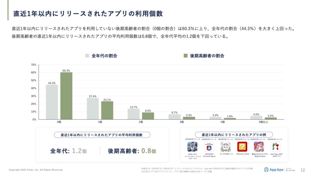 後期高齢者の直近1年以内にリリースされたアプリの平均利用個数は0.8個で、全年代平均の1.2個を下回っている。新規アプリへの接触は限定的であることが示されています。