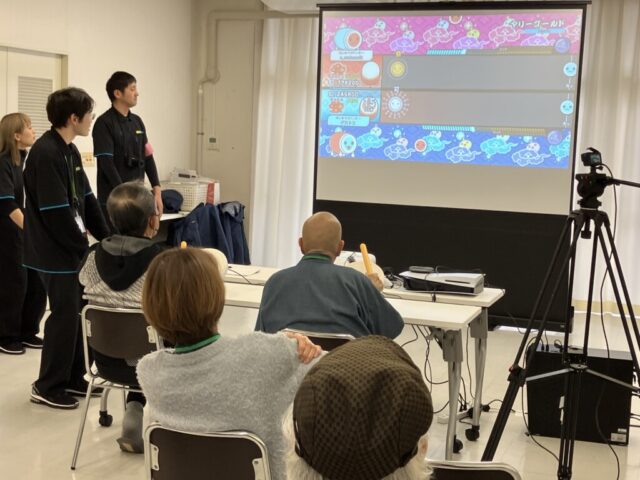 高見フローラルタウン団地・グリーンヒルズ六甲団地ともに8名の団地居住者が参加しました。リズムゲームは全員が初めて行うということで、最初は戸惑いながら和太鼓を叩いていましたが、練習を重ねるにつれてリズムに乗れるようになり、得点も上昇していきました。2人ずつプレイしている間に、他の方々も音楽に合わせて手拍子や膝をたたいて声を出し合い、会場は和やかな雰囲気に包まれました。ゲームを終えた後は、みなさんホッとした表情で笑顔が見られたのが印象的でした。