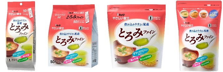 「やさしい献立 とろみファイン 1.5g×50本」「同 300g」「同 600g」はパッケージリニューアルです。