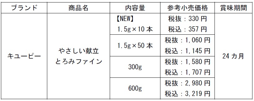 キユーピー株式会社(本社:東京都渋谷区、代表取締役 社長執行役員:髙宮 満、以下キユーピー)は、「やさしい献立」シリーズの「とろみファイン」から、初めての方でも手に取りやすい10本入りを2026年3月5日(木)から新発売します。また、既存の3品についてもパッケージデザインをリニューアルします。