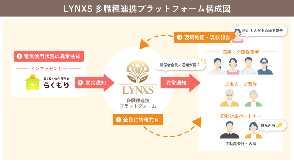 本提携により、LYNXSの新機能としてR65不動産が提供する電力使用量をモニタリングする見守りサービス「らくもり」をLYNXSの多職種連携プラットフォームと連動させ、不動産管理会社・大家による迅速な初動対応と、医療・介護者や本人家族への同時通知を可能にします。さらに、初動対応にあたった不動産管理会社・大家がLYNXSを通じて現場の状況を報告することで、医療・介護の専門職やご家族がより早く適切な対応を取ることができます。これにより、高齢入居者の孤独死の防止と、事故物件化のリスク軽減を同時に実現します。