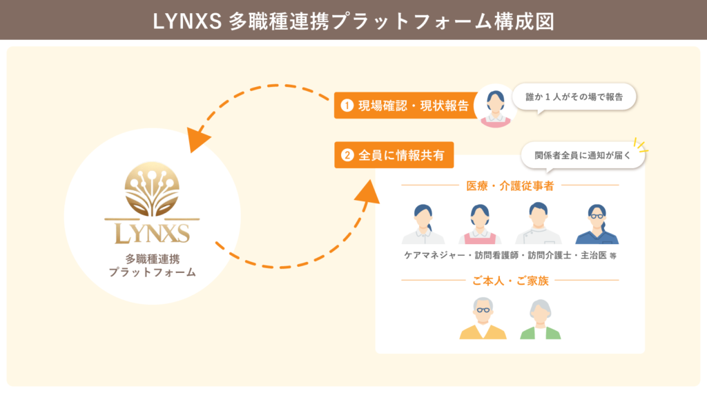 現場確認・現状報告をするとLYNXSを通して、医療・介護従事者とご本人・ご家族全員へ通知される。