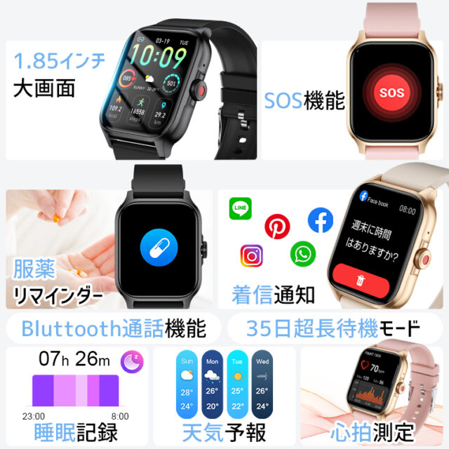 また、1.85インチの大画面ディスプレイを採用しており、通知や情報を見やすく表示できる点も特長です。