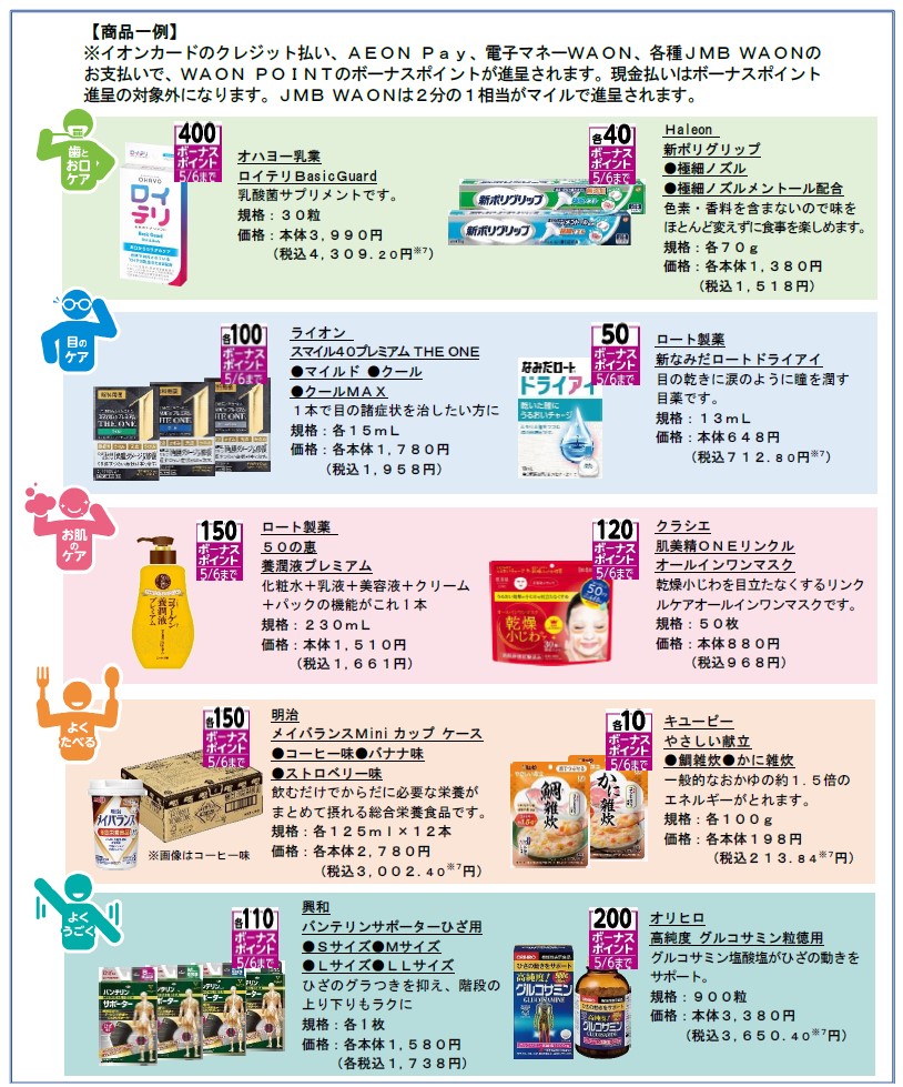 ※3:イオンカードのクレジット払い、AEON Pay、電子マネーWAON、各種JMB WAONのお支払いで、WAON POINTのボーナスポイントが進呈されます。現金払いはボーナスポイント進呈の対象外になります。JMB WAONは2分の1相当がマイルで進呈されます。