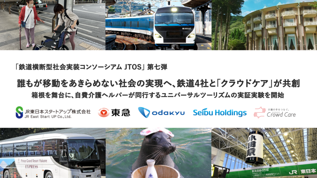 1回60分から都度利用できる、自費訪問介護・自費訪問リハビリ・家事・生活支援サービス「Crowd Care(クラウドケア)」を運営する株式会社クラウドケア(本社:東京都渋谷区、代表取締役CEO:小嶋潤一)は、JR東日本スタートアップ株式会社、東急株式会社、小田急電鉄株式会社、西武ホールディングスの4社が連携する鉄道横断型社会実装コンソーシアム「JTOS(ジェイトス)」と、ユニバーサルツーリズムの実証実験を開始することをお知らせいたします。JTOS各社が有する公共交通機関やバリアフリー施設と、クラウドケアの介助スキルを備えたヘルパーという双方の強みを組み合わせることで、年齢や障がいの有無に関わらず、誰もが移動することを諦めずに済む社会の実現を目指します。