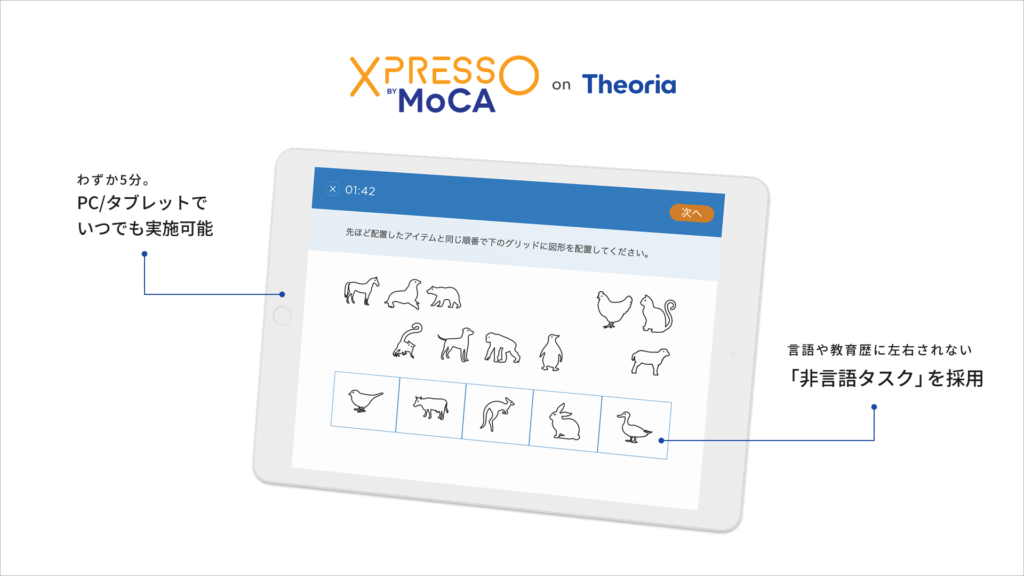 テオリアは、この「検査のハードル」を解消すべく、「MoCA」の理論に基づいた、5分でセルフチェック可能なデジタルツール「エクスプレッソ」を日本市場へ導入。これにより、これまで見逃されがちであった認知機能低下リスクに早期に気づく機会を創出します。