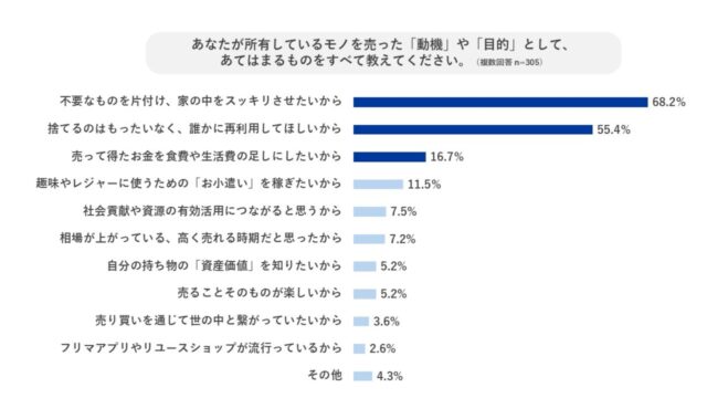 売却の動機としては「不要なものを片付け、家の中をスッキリさせたいから(68.2%)」が最多で、次に「捨てるのはもったいなく、誰かに再利用してほしいから(55.4%)」となりました。これは、「売って得たお金を食費や生活費の足しにしたいから(16.7%)」や「趣味やレジャーに使うための『お小遣い』を稼ぎたいから(11.5%)」といった金銭的な理由よりも多い結果となっています。