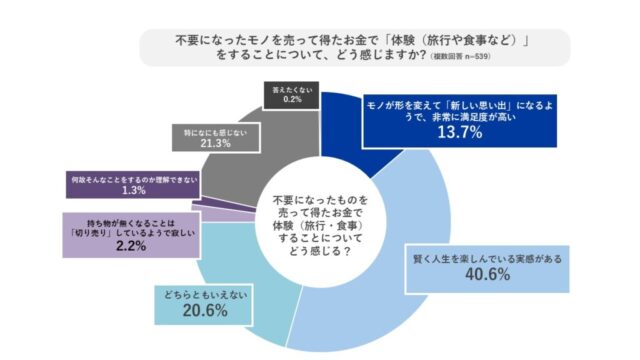 ・モノを売って得た資金を体験に再投資する行動について、「賢く人生を楽しんでいる(40.6%)」「満足度が高い(13.7%)」と、過半数が高く評価。