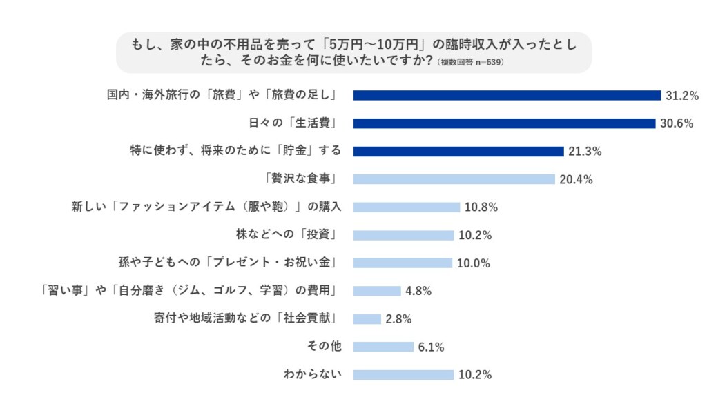 「もし、家の中の不用品を売って「5万円~10万円」の臨時収入が入ったとしたら、そのお金を何に使いたいですか」と聞いたところ、1位は「国内・海外旅行の『旅費』や『旅費の足し』(31.2%)」となり、「日々の『生活費』(30.6%)」を上回りました。「贅沢な食事(20.4%)」と合わせると、過半数が体験(コト消費)への支出を希望していることが分かります。不要なモノを売って得た資金を生活費の補填ではなく、旅行などの非日常的な体験に「再投資」したいという結果は、趣味や社会活動などに意欲的で、余暇を積極的に楽しむアクティブシニアならではの傾向と言えるかもしれません。